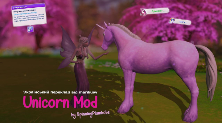Короткий опис: Мод додає єдинорогів як повноцінних окультів, нові взаємодії із ними, мудлети, рису характеру та рису ділянки.